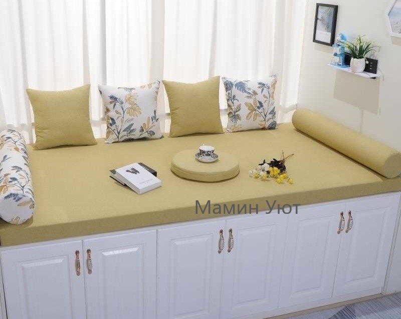Уютный поролоновый матрас на подоконник со съемным чехлом из рогожки, наполнитель листовой поролон, толщиной 5, 8, 10 см. Возможно изготовление по индивидуальным размерам. Валики и подушки в стоимость не входят и рассчитываются отдельно.